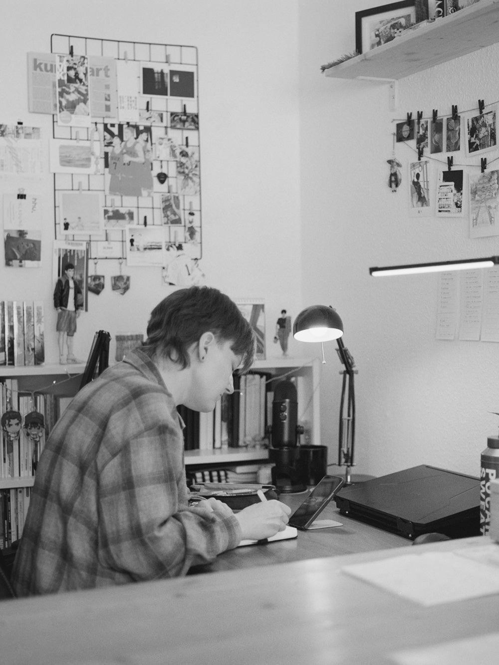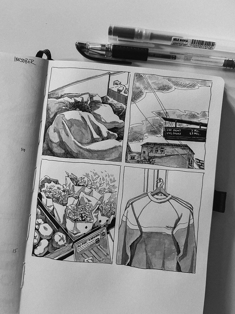 In meinen Skizzenbüchern halte ich am liebsten flüchtige Momente aus dem Alltag fest – leise, unscheinbare Dinge, die oft übersehen werden. Dabei zeichne ich meist traditionell mit Bleistift und Tusche auf Papier, und arbeite mittlerweile auch an meinen ersten eigenen Geschichten.